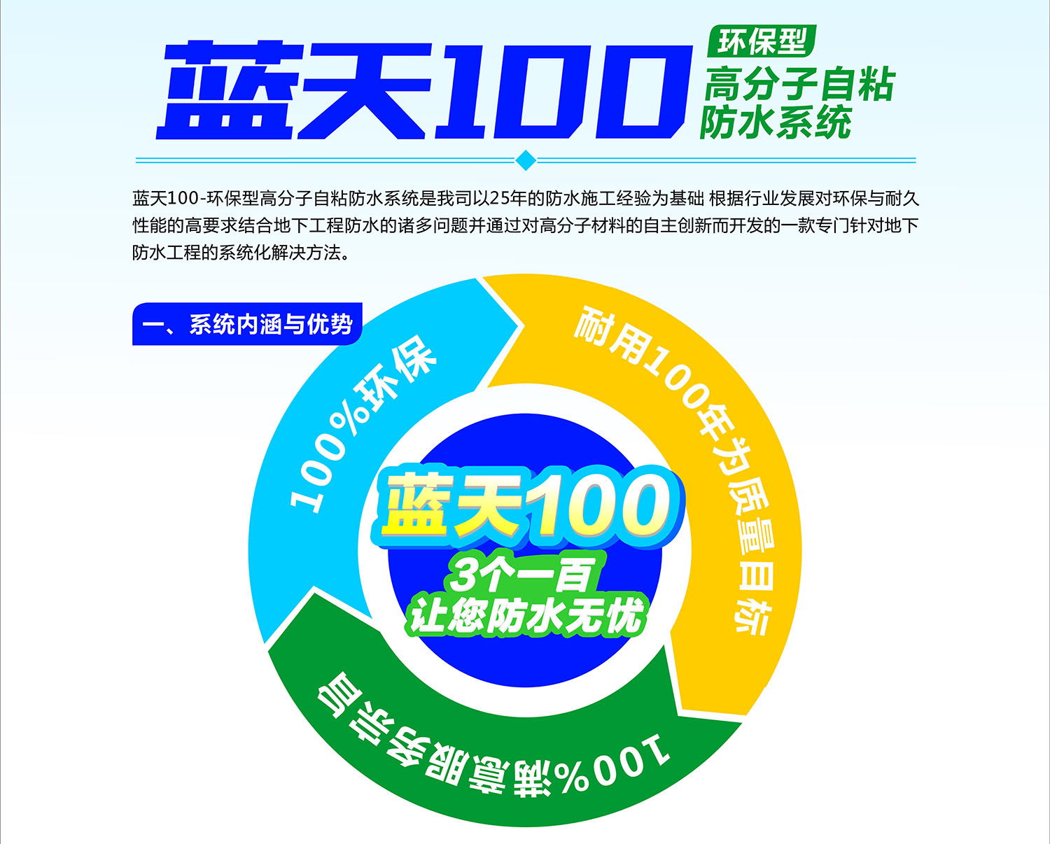 “藍天100”以100%環保、耐用100年(nián)為(wèi)質量目标、100%滿意服務宗旨三個(gè)一(yī)百為(wèi)内涵和優勢,真正做到(dào)讓您防水(shuǐ)無憂!