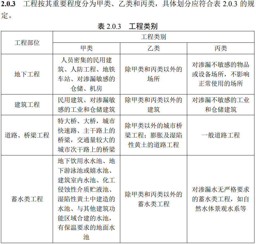 2.0.5 工(gōng)程防水(shuǐ)等級應依據工(gōng)程防水(shuǐ)類别和工(gōng)程防 水(shuǐ)使用環境類别确定,并應符合下(xià)列規定: