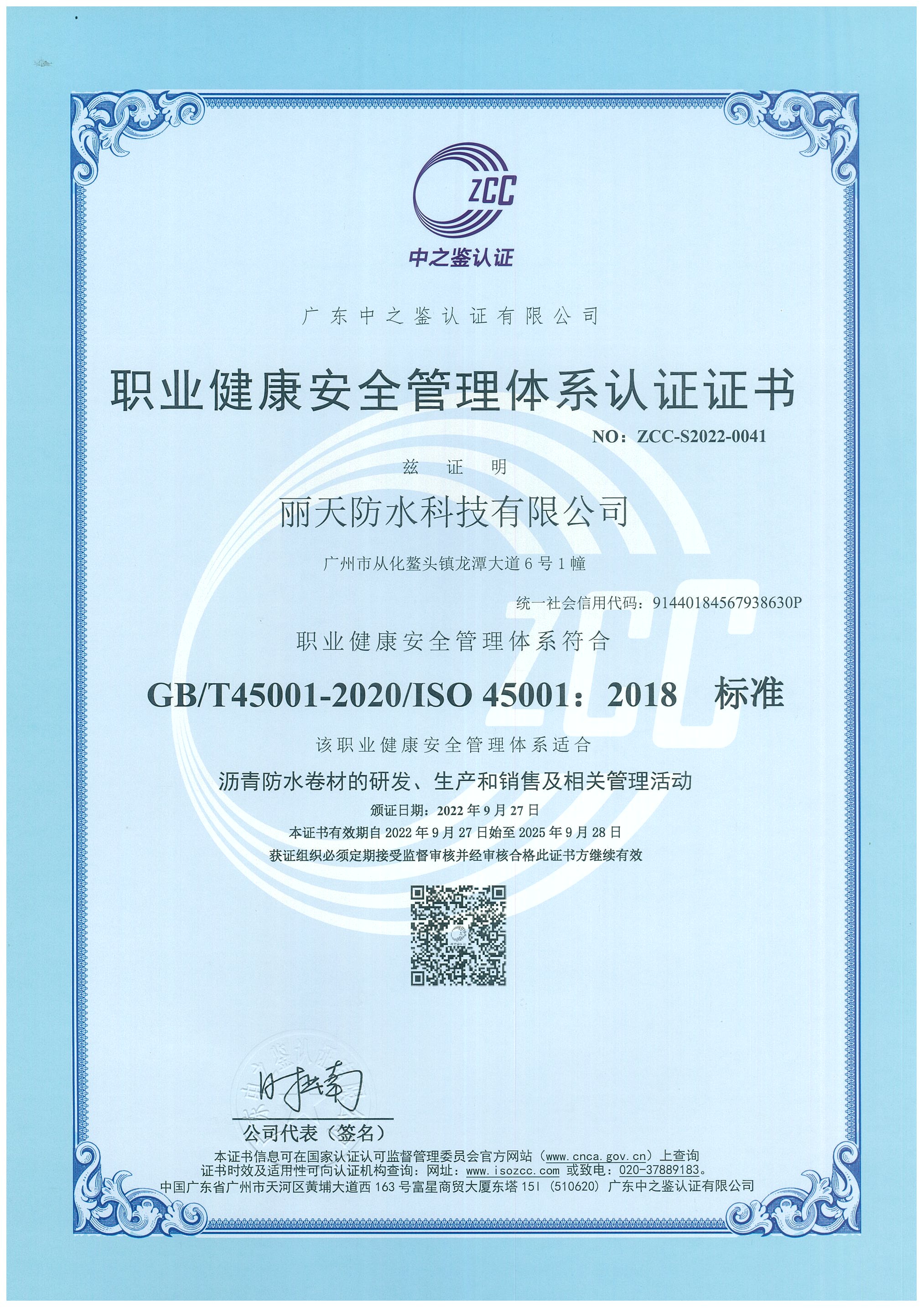 喜訊|麗天防水(shuǐ)再次獲得ISO9001、ISO14001、ISO45001三體系認證