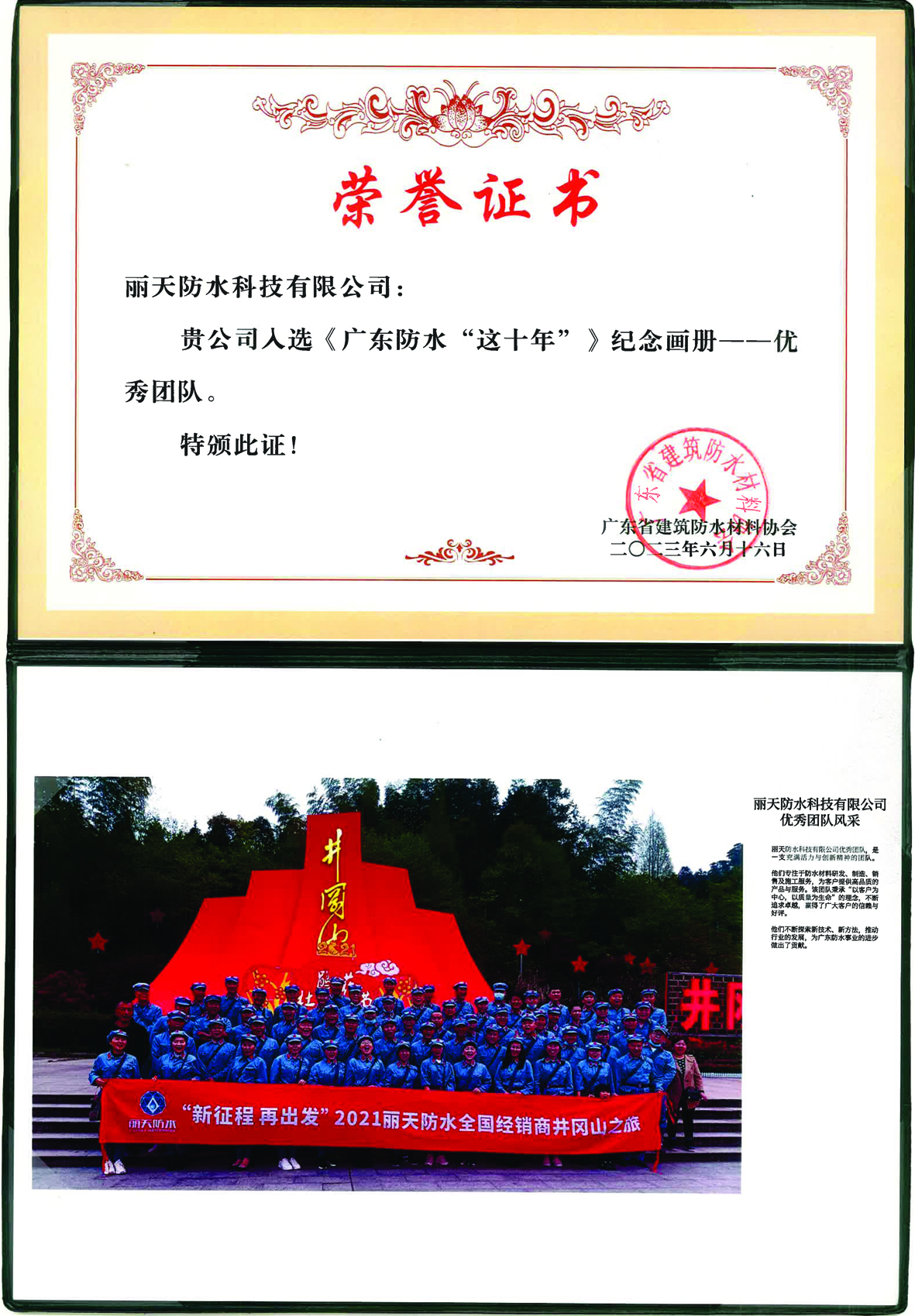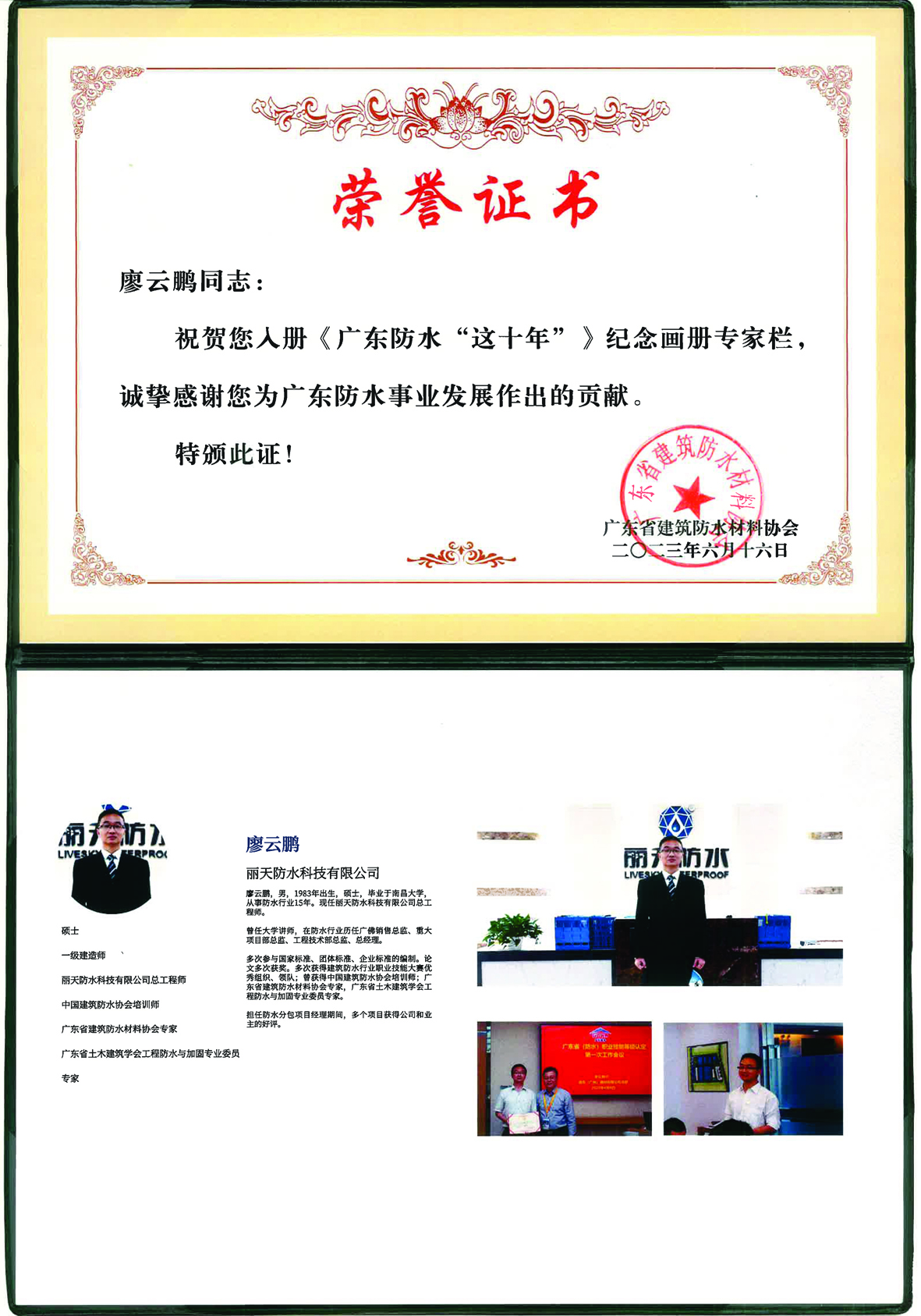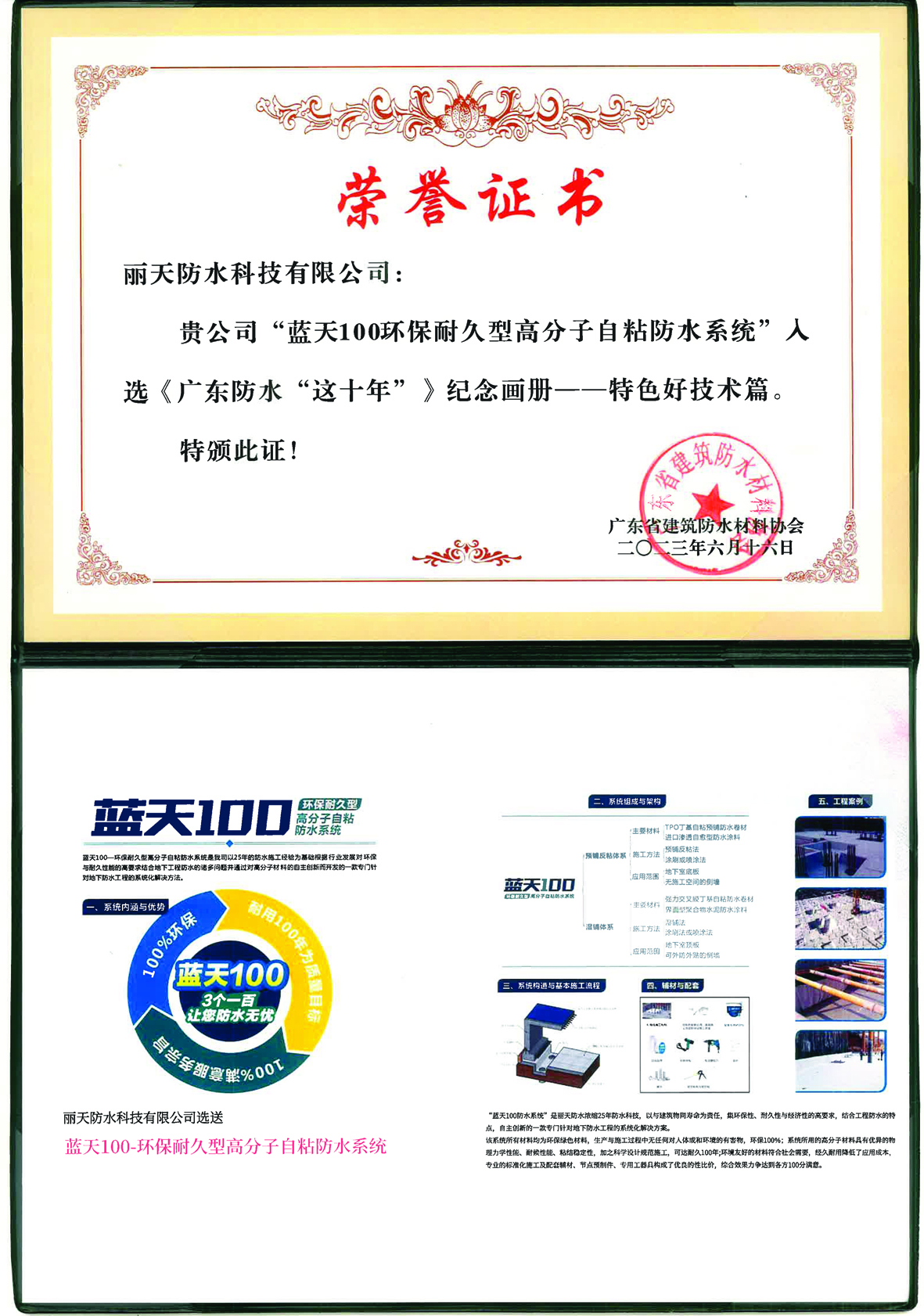麗天防水(shuǐ)的突出事(shì)績和人物(wù)得到(dào)了省防水(shuǐ)協會(huì)的表彰:麗天防水(shuǐ)團隊成功入選廣東防水(shuǐ)“這十年(nián)”紀念畫(huà)冊冊—優秀團隊、“藍天100環保耐久型高(gāo)分子自(zì)粘防水(shuǐ)系統”成功入選廣東防水(shuǐ)“這十年(nián)”紀念畫(huà)冊—特色好技(jì)術(shù)、麗天技(jì)術(shù)總工(gōng)廖雲鵬成功入選廣東防水(shuǐ)“這十年(nián)”紀念畫(huà)冊—專家欄。榮譽與麗天同在,時刻鞭策著(zhe)我們。